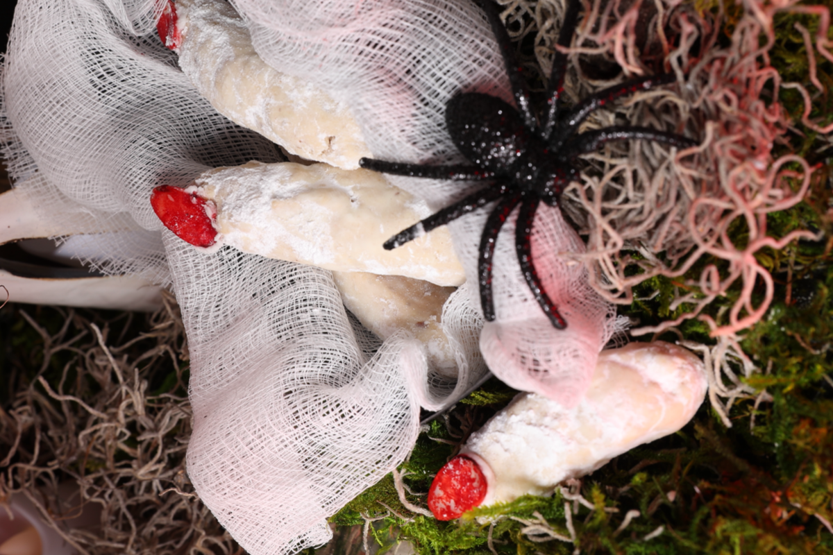 Apply a small drop of the icing to one end of each finger and attach the “nail”. Let set and arrange on platter or into treat boxes.